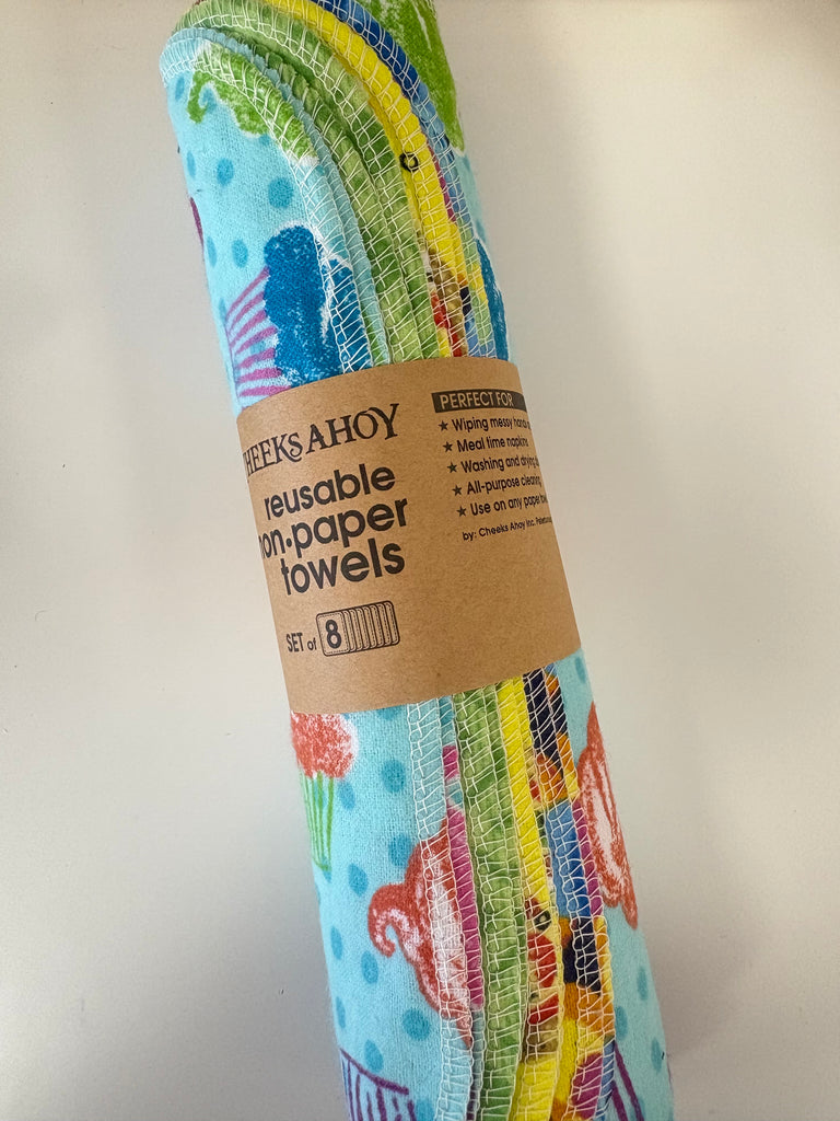 Eliminate the use of paper towels and napkins with this eco-friendly replacement! PERFECT FOR ★wiping messy hands and faces after meals ★spill clean-up ★washing and drying dishes ★mealtime napkins ★lint-free cleaning and dusting Pre-rolled on a sturdy 100% kraft paper tube, use with any paper towel dispenser. Made from 100% cotton flannel. Each unpaper towel is single ply and measures 12" x10". Photos are to show examples only, our prints change regularly but they are always exciting! Available in set of 8 or 12.